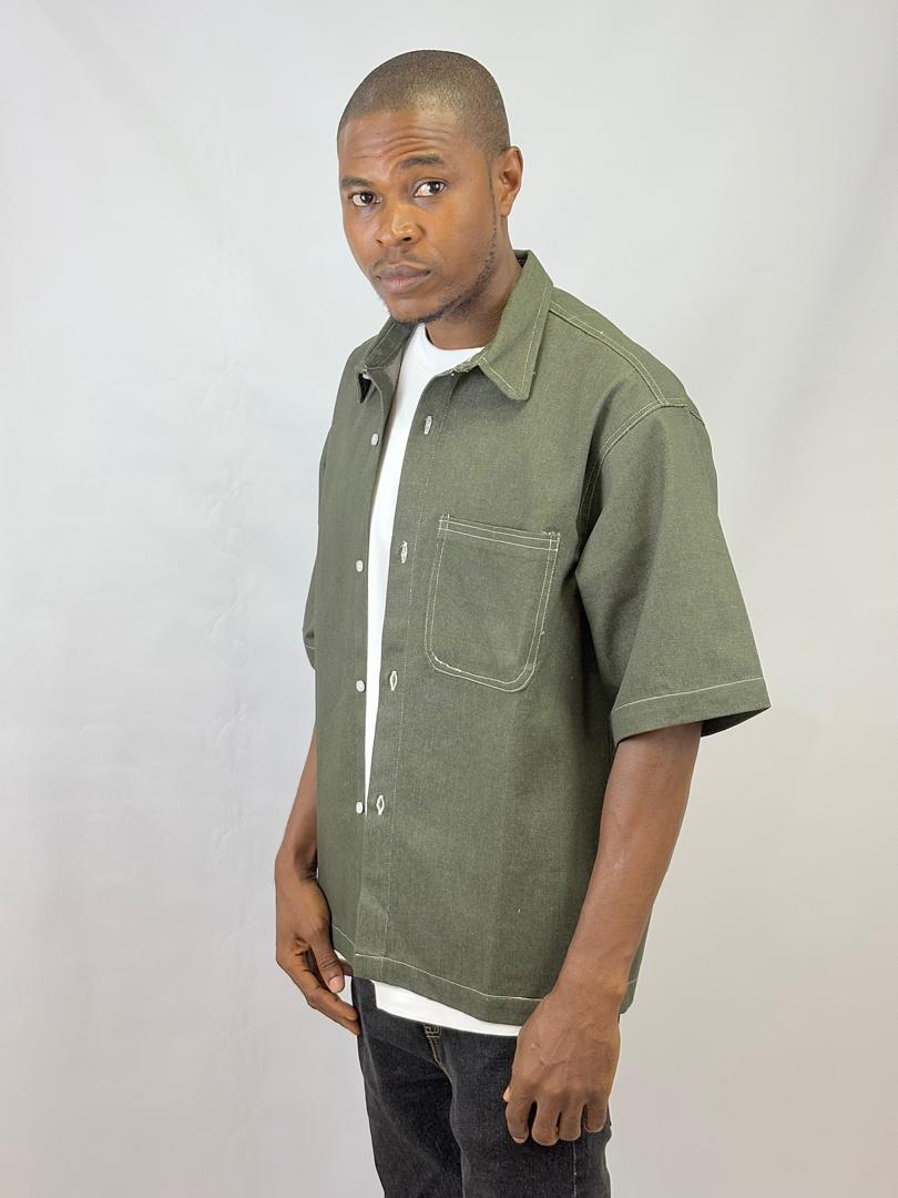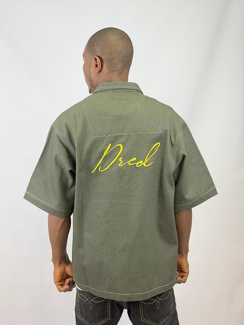 This deep green denim reflects growth and resilience. The shirt features a striking "dred" monogram boldly emblazoned on the back. This durable piece embodies a rugged style in combination with a fearless attitude.